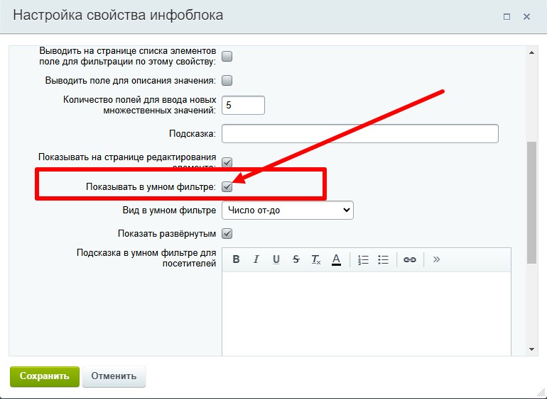 Важно! При добавлении свойства в фильтр оно не должно быть пустым. Т.е. сначала заполняете свойство значением в карточках объекта, а только потом выводите его в фильтр.