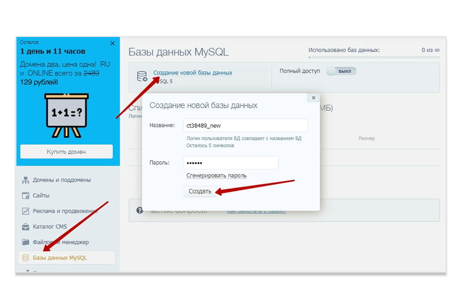 - Создаём Базу данных, для этого заходим во вкладку "Базы данных MySQL", указываем имя базы данных и пароль